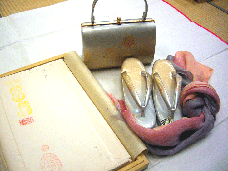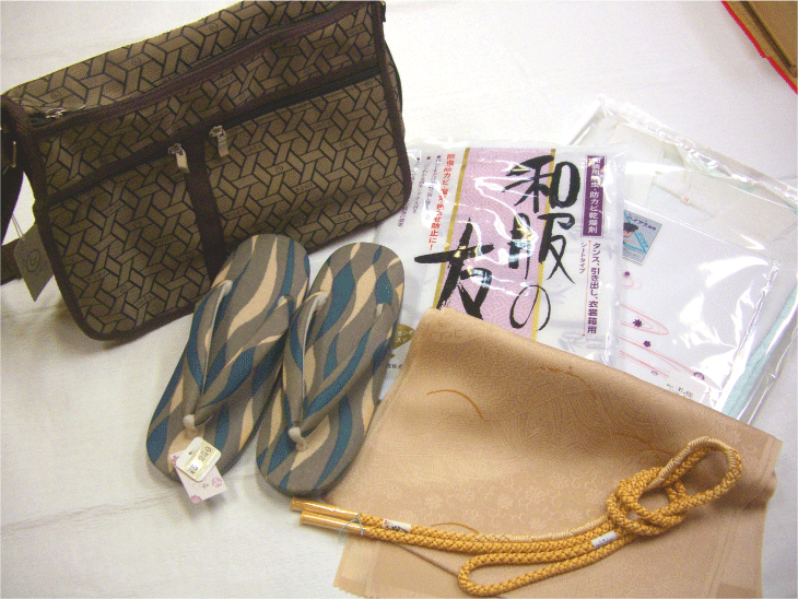 (二部式襦袢、半衿、帯締め、帯揚げ、草履、バッグ、和服の友)