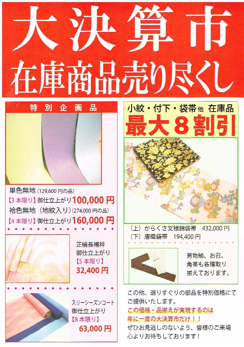 在庫品総売りつくし、最大8割引となっております!その他、特別企画品もご用意!なくなり次第終了となりますので、是非お早めにご来店ください!