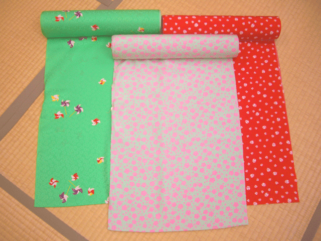 向かって左から、風車、梅、鈴の模様です。柄もかわいらしいですが、お色がすごいインパクトですよね。