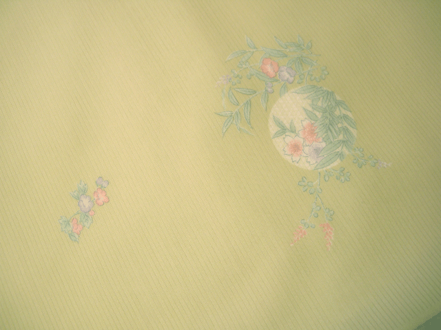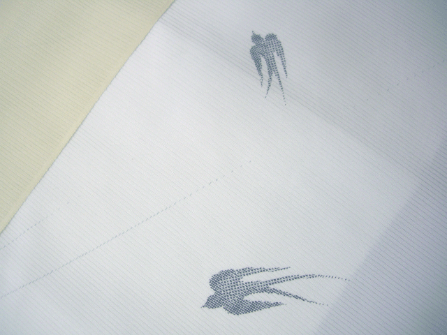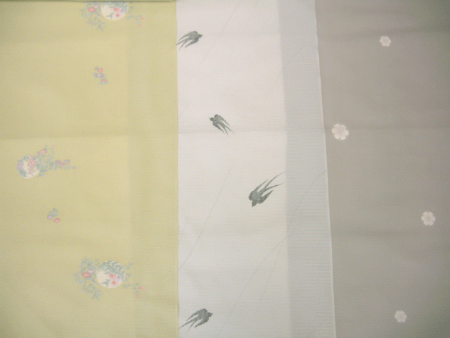 左から、薄緑の花柄、薄青のつばめ柄、薄灰色の雪輪柄で、
