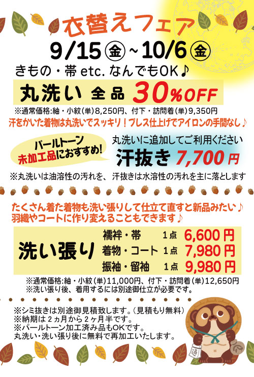 9月15日(金)から10月6日(金)まで恒例「衣替えフェア」開催します!