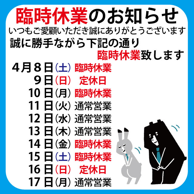4月29日(土・祝)休業