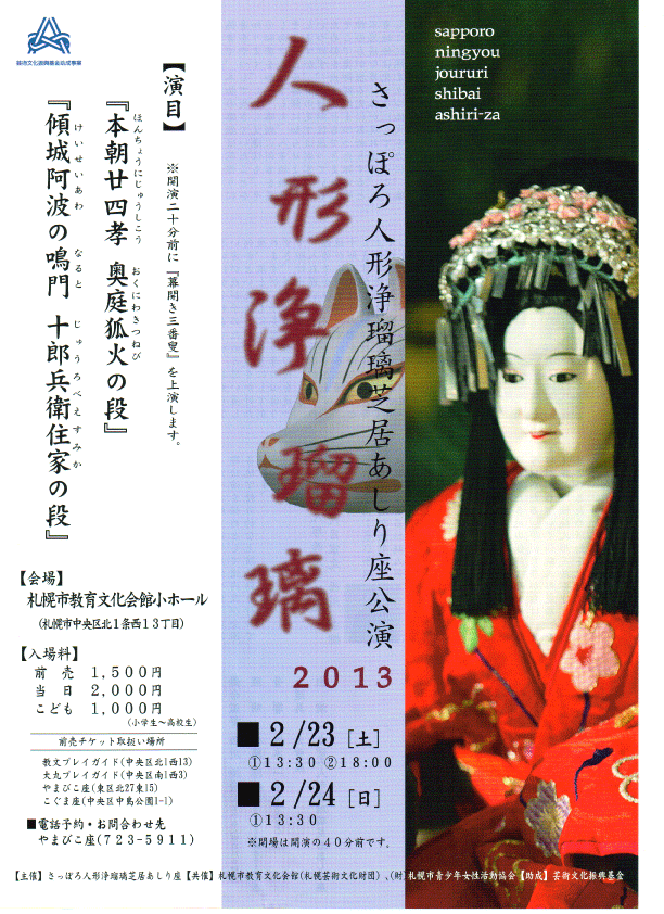2月23日(土)、24日(日)に、札幌市教育文化会館小ホールで人形浄瑠璃の公演があります。