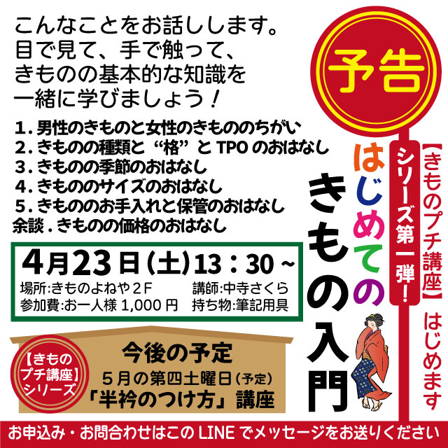 【きものプチ講座】では、着物や浴衣についての実用知識・知っておいたら便利なコトを一緒に学びます。一回だけの参加でOK♪お気軽にご参加ください!
