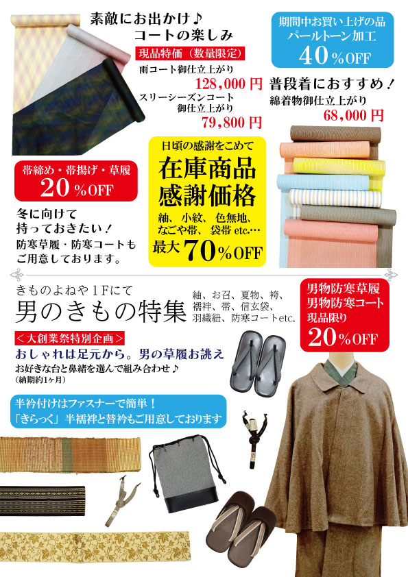 1Fでは男のきもの特集。特別企画として、男の草履お誂えをご用意。お好きな台と鼻緒をお選びいただけます。