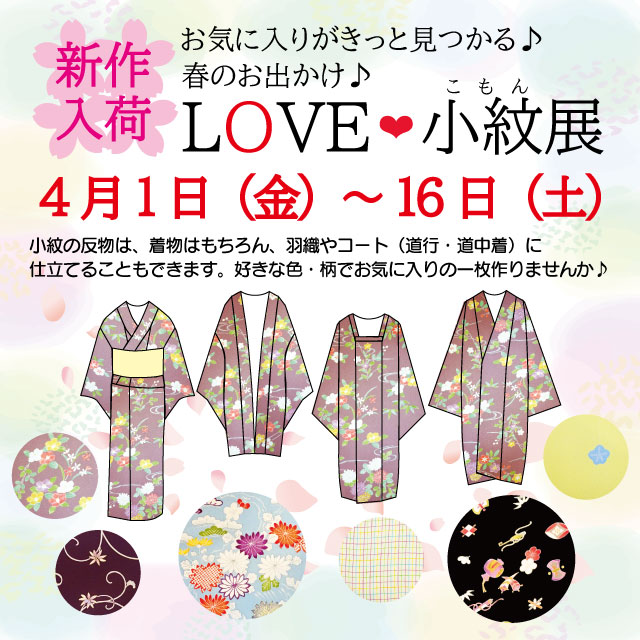 小紋は、着物はもちろん、羽織やコート(道行・道中着)に仕立てることもできます。この度、4月16日までの期間限定で、「春のお出かけ♪LOVE小紋展」を開催します!