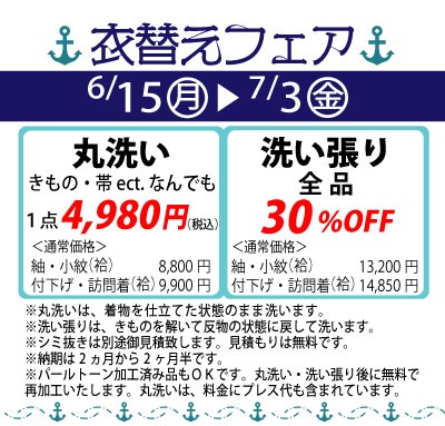 丸洗いは何でも一点4,980円(税込)、洗い張りは全品30%OFFです。